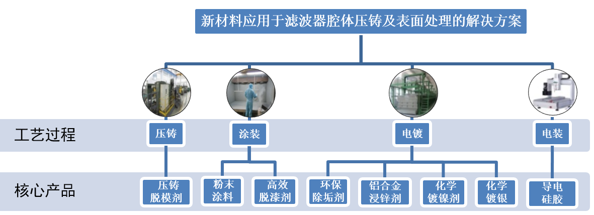 新材料应用于滤波器制造的解决方案涉及到滤波器腔体的压铸、涂装、电镀、电装四个工艺过程,包括了压铸脱模剂、粉末涂料、高效脱漆剂、环保除垢剂、铝合金浸锌剂、化学镀镍剂、化学镀银、导电硅胶等7种核心产品和前处理除油剂、酸洗剂等基础产品,旨在进一步提高滤波器的整体性能、生产效率、环保性、可持续发展性。